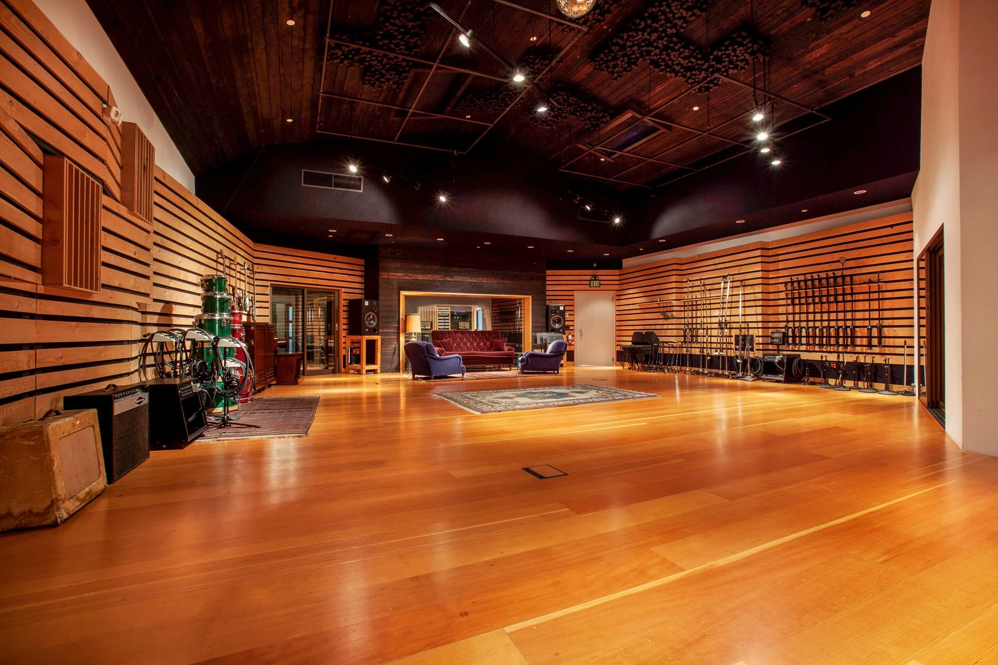 25th Street offers 3 primary recording spaces, acoustically isolated, and designed for easy visual communication. Our large, wood live room breathes ambient life into recordings and creates a sense of warmth and presence. This 1400 square foot room can be set up in a variety of ways to accommodate large setups including chamber orchestras for film scoring. Skylights in the ceiling flood the room with natural daylight.